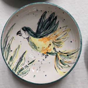 2023Tapas schaaltje van keramiek blauw met pelikanen Diameter 13 cm x hoogte 6 cm Geglazuurd Te koop samen met plank 25 euro, het schaaltje alleen 10 euro, plank 15 euro. Elke naam kan er ingebrand worden.